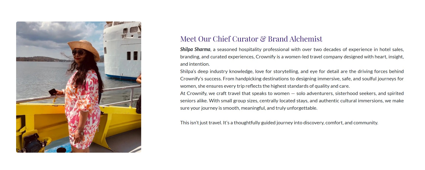 “Every destination is personally vetted, every itinerary thoughtfully designed — so you can travel smarter, deeper, and freer. Whether you’re a solo traveler or a spirited senior, Crownify is your gateway to unforgettable escapes, curated with care.”